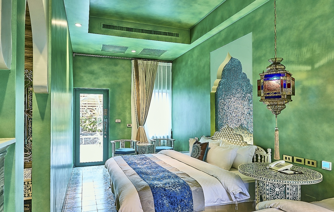 80坪的獨立VILLA,綠意盎然、椰影婆娑,露天專屬花園猶如一座奢華的私人宮殿。法國殖民風,翡翠寶石般的濃烈色澤,精緻而細膩,古老銅盤桌、仿古染白的老柚木傢俬,浪漫床頭紗幔,混搭出淡淡的法式優雅。
